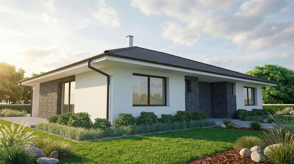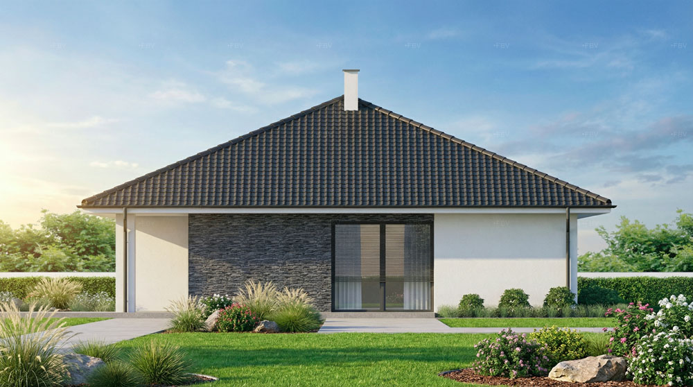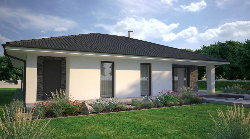 Venkovní část je reprezentativní. Za zmínku stojí kamenné obložení, které podtrhuje moderní design celého domu. Dům svojí výškou bude ideálně zapadat do klasické zástavby.